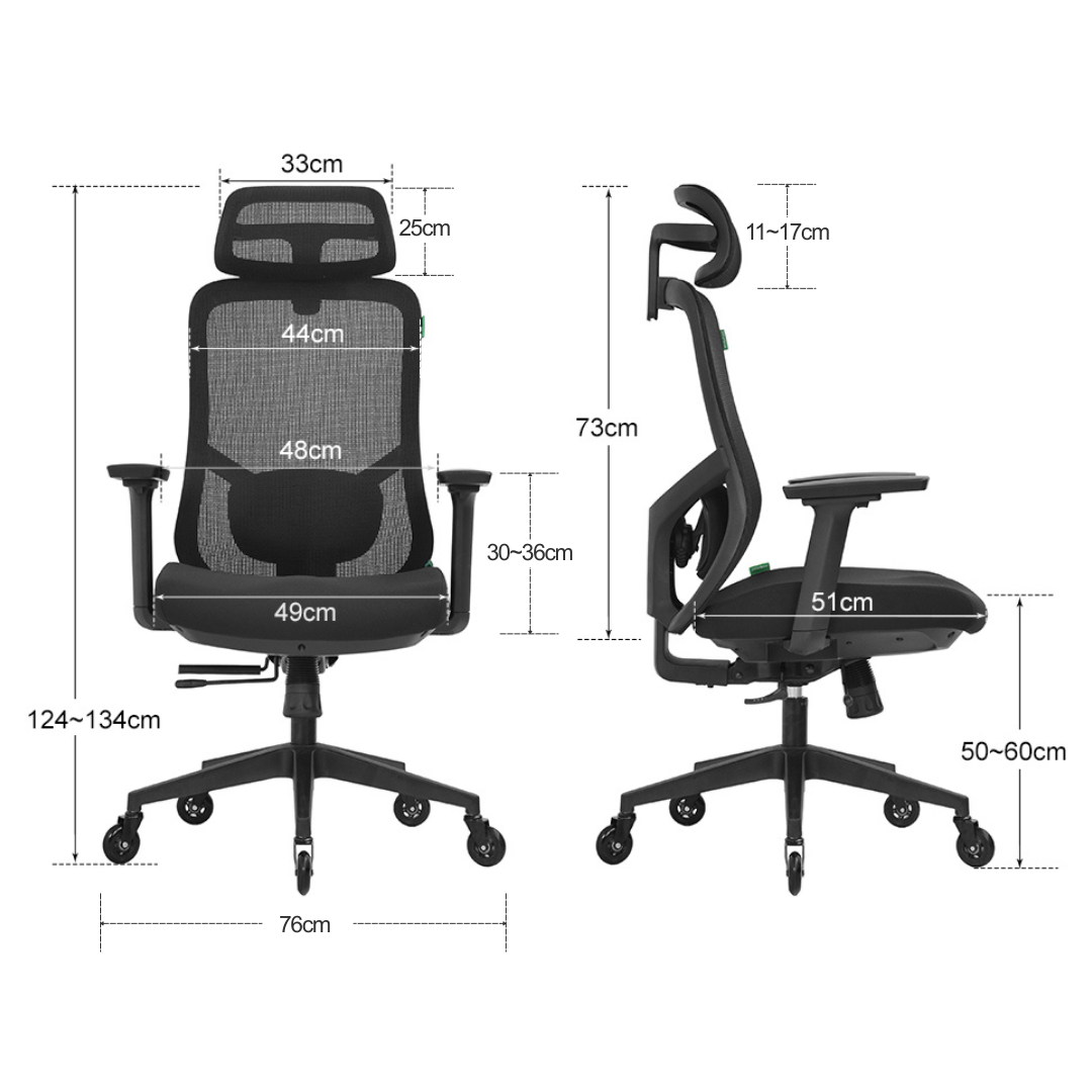 - Rugleuning: Nylon mesh met verstelbaar ergonomisch frame